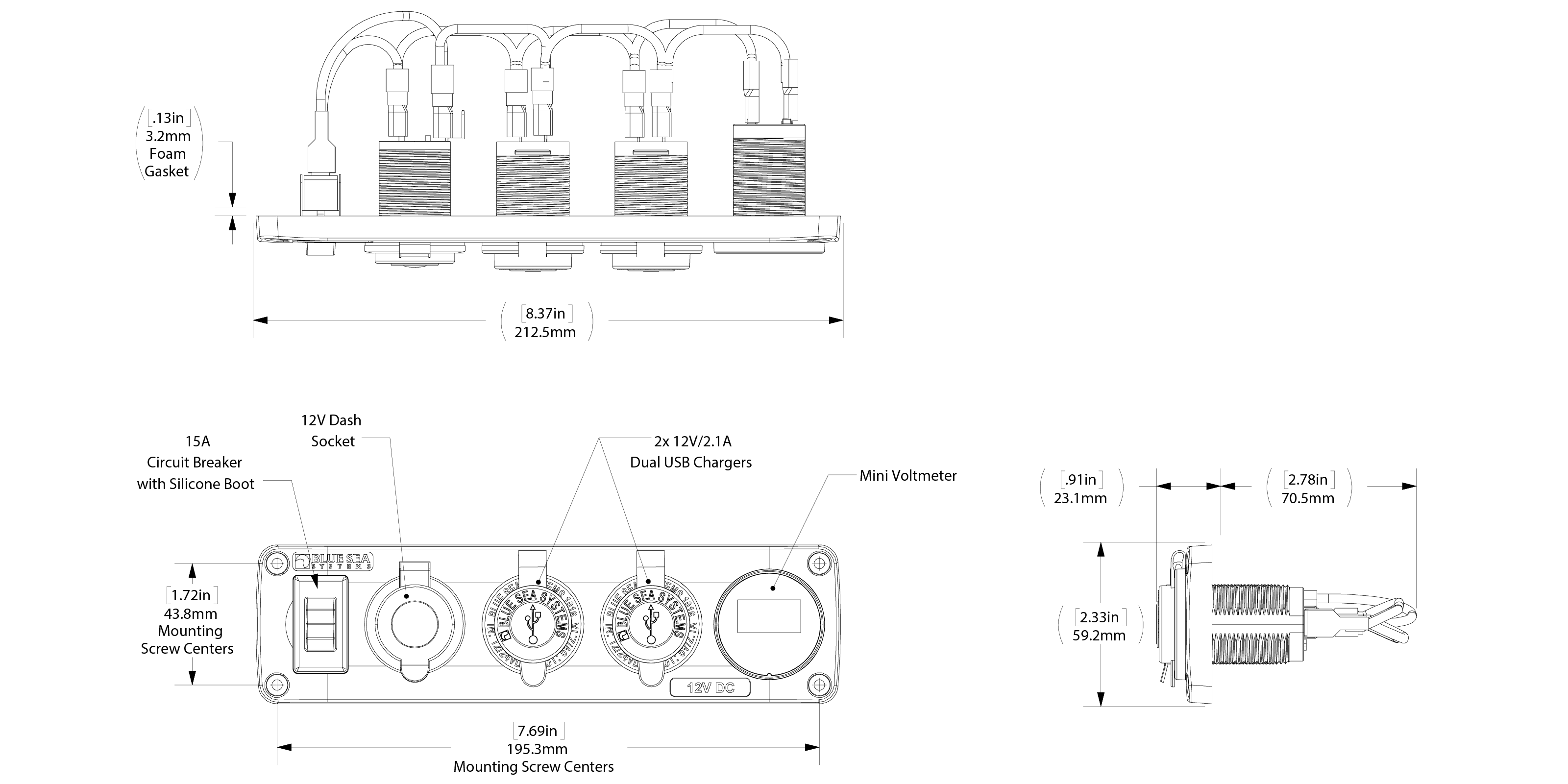 Accessory panels include a 15A circuit breaker switch and a 20' pre-wired harness.