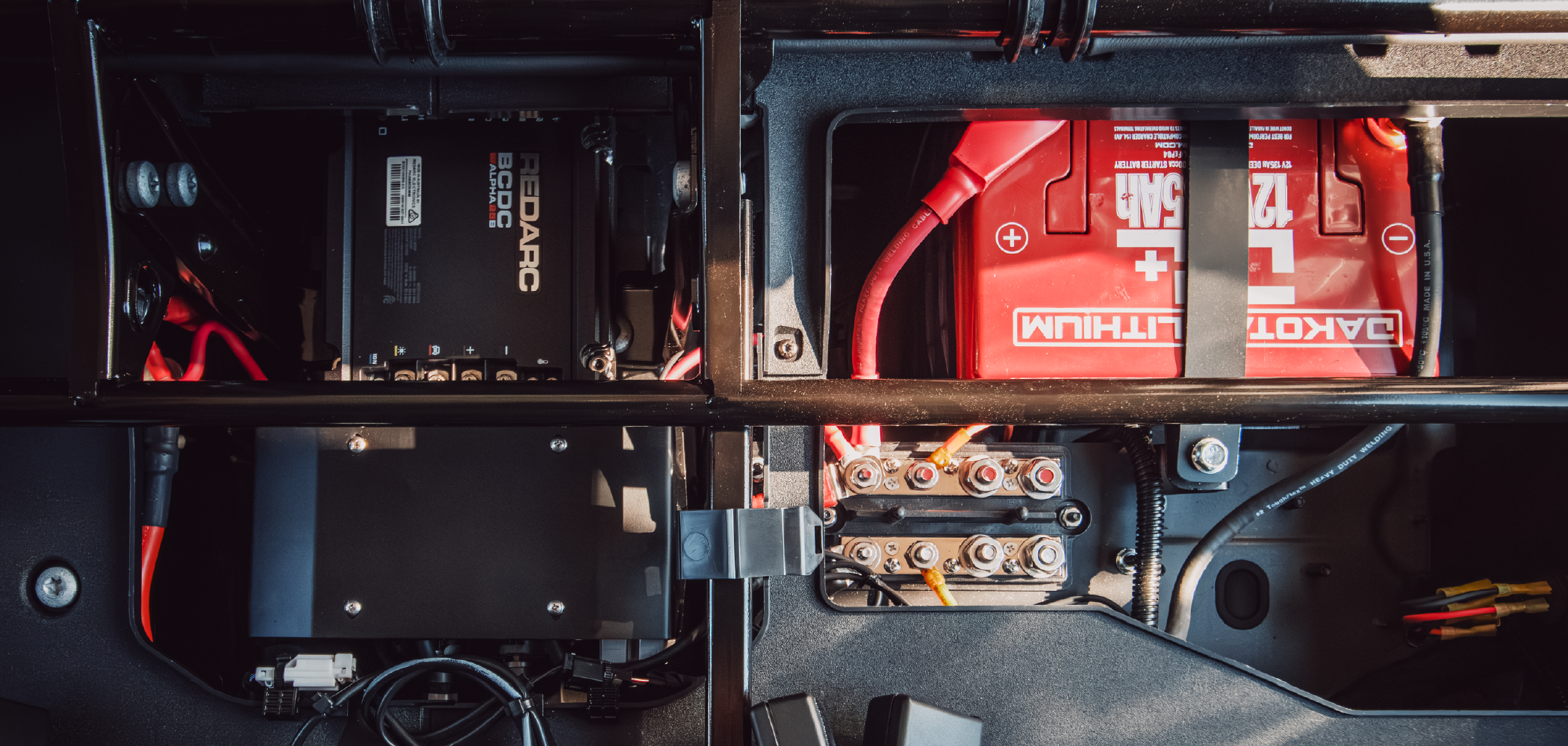 The OMEGA system includes an easy to install bracket that is completely pre-wired with a Redarc Alpha 25 amp DC-DC charger that mounts under the center of the back seat. Comes with a 50 amp Anderson connector for easily plugging in solar panels.
