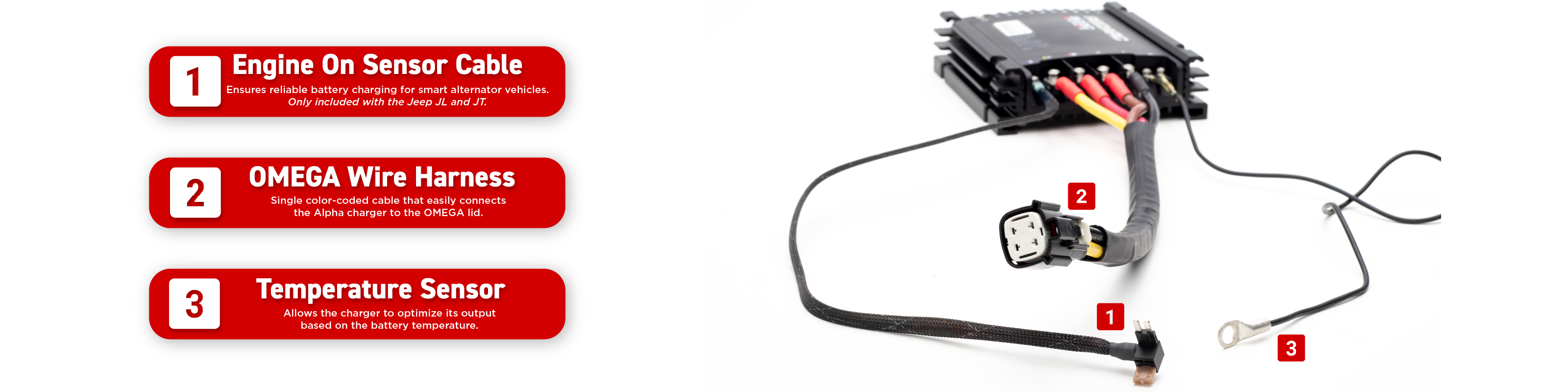 The OMEGA system includes the steel battery tray, a completely pre-wired top lid, and a Redarc Alpha 25 amp DC-DC charger with a mounting bracket. Choose your cranking battery and accessory battery from the options below for the most complete and easiest to install dc-dc charger based dual battery system on the market.