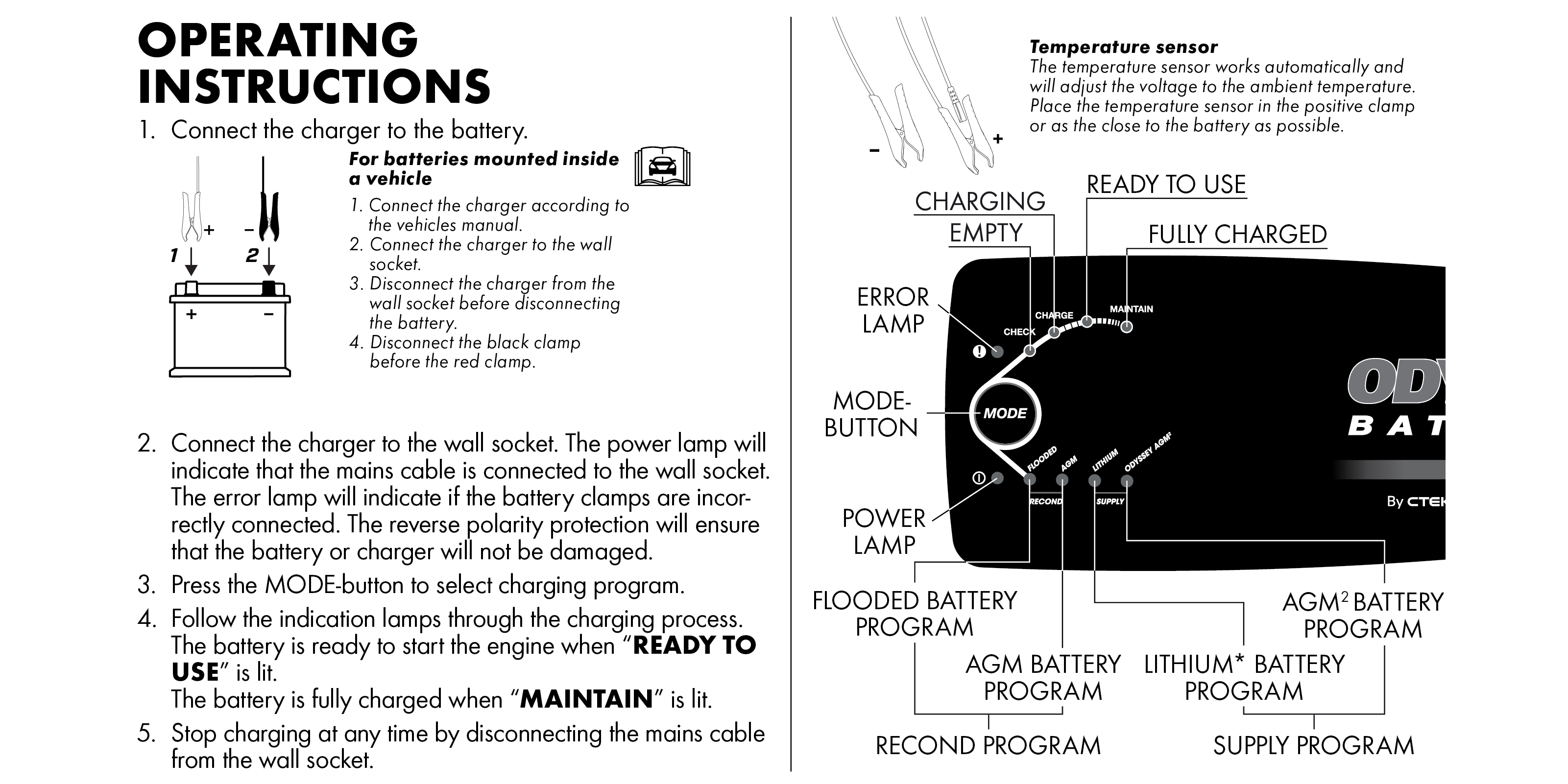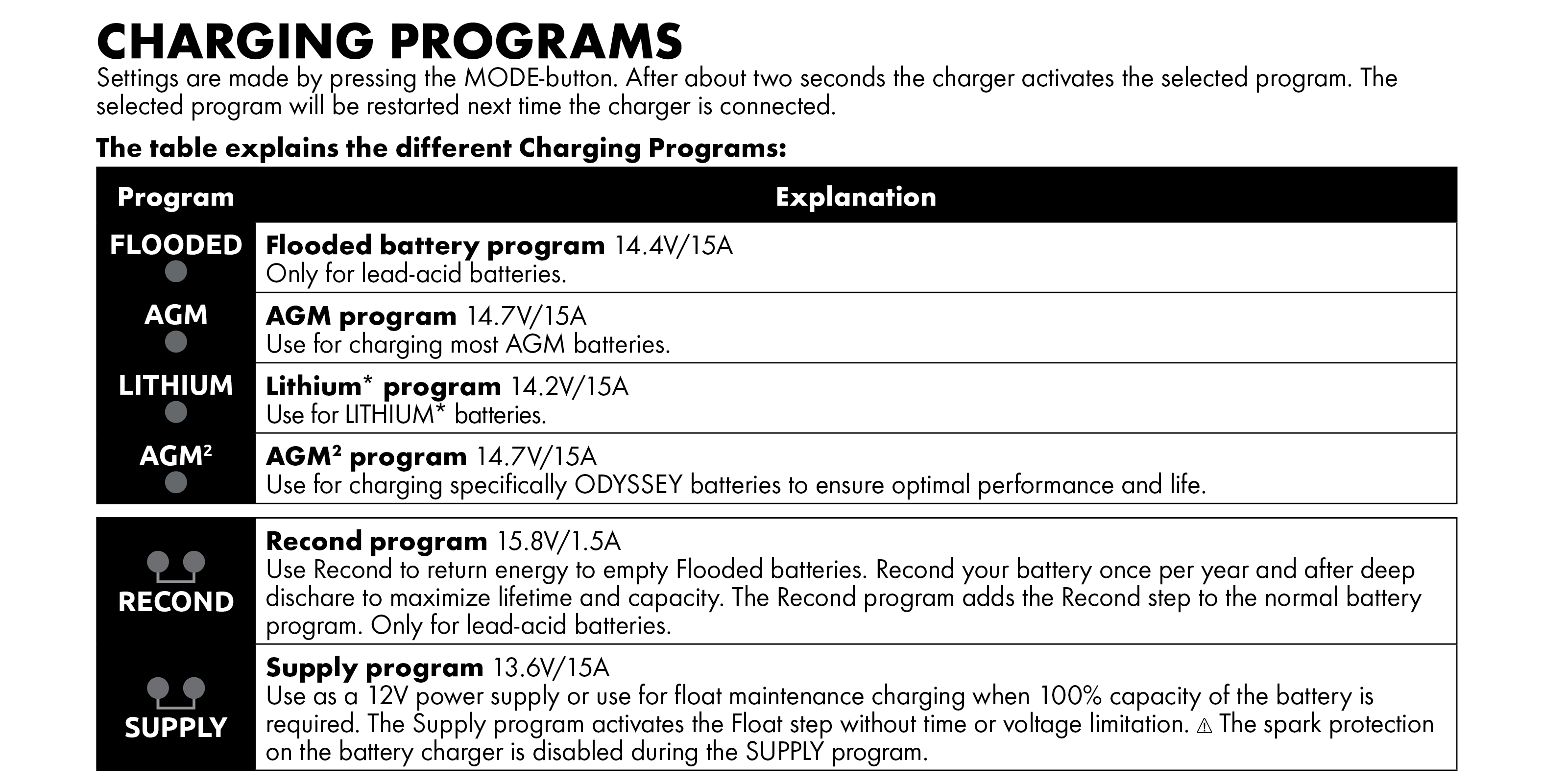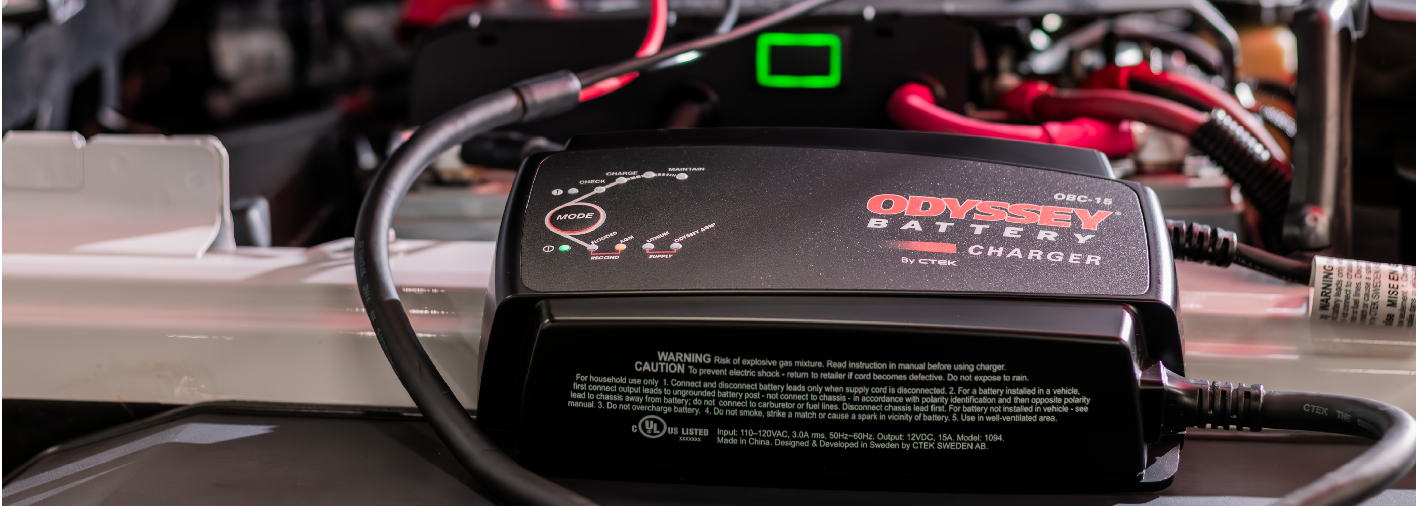 Designed for everyday vehicle battery applications, the ODYSSEY battery 15 Amp charger is a lightweight and versatile charging solution. It is the first charger designed to charge both 12-volt Absorbed Glass Mat (AGM), flooded lead acid batteries and 12-volt lithium batteries (LiFePO4, Li-Fe, Li-iron, LFP).