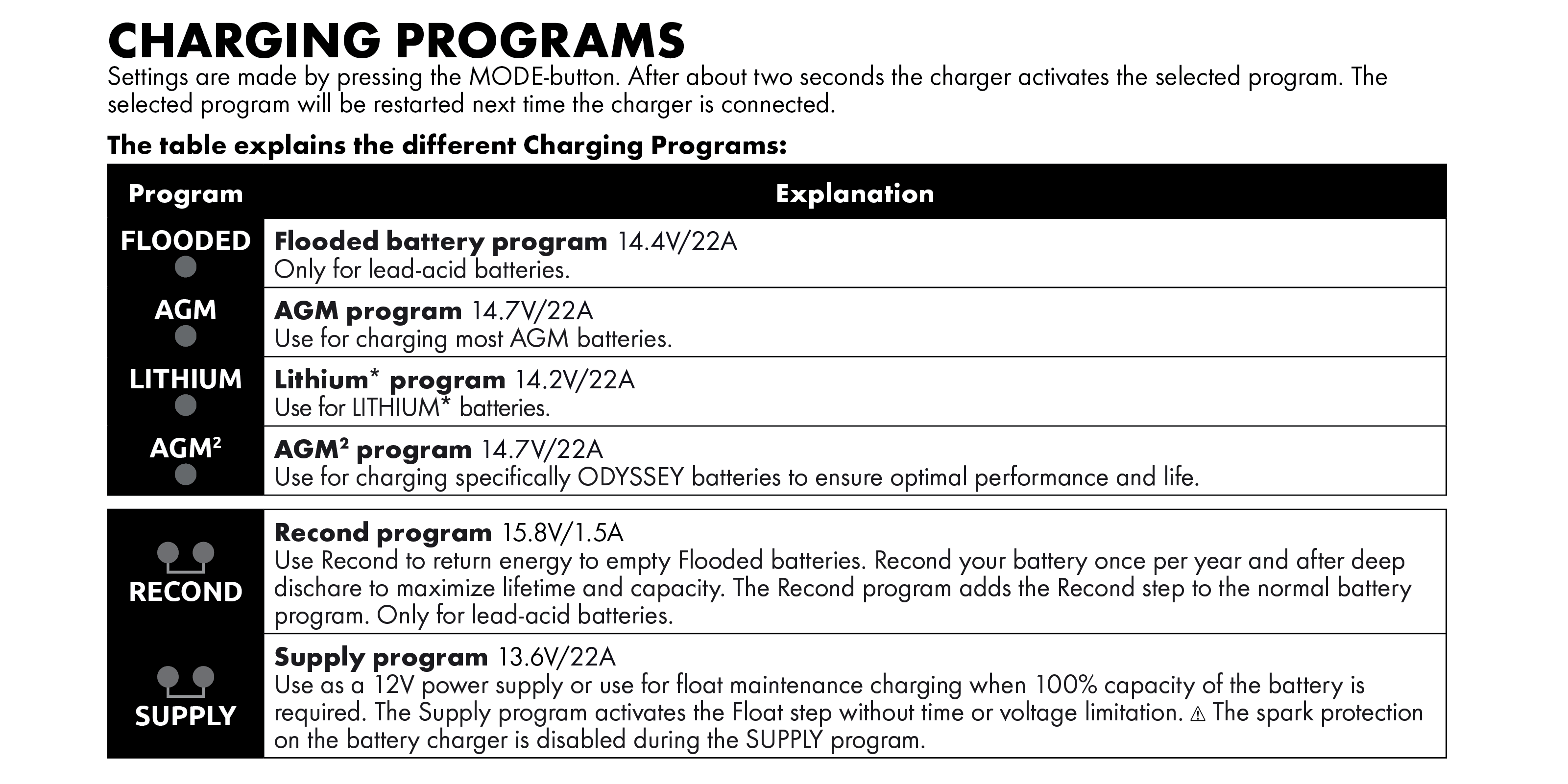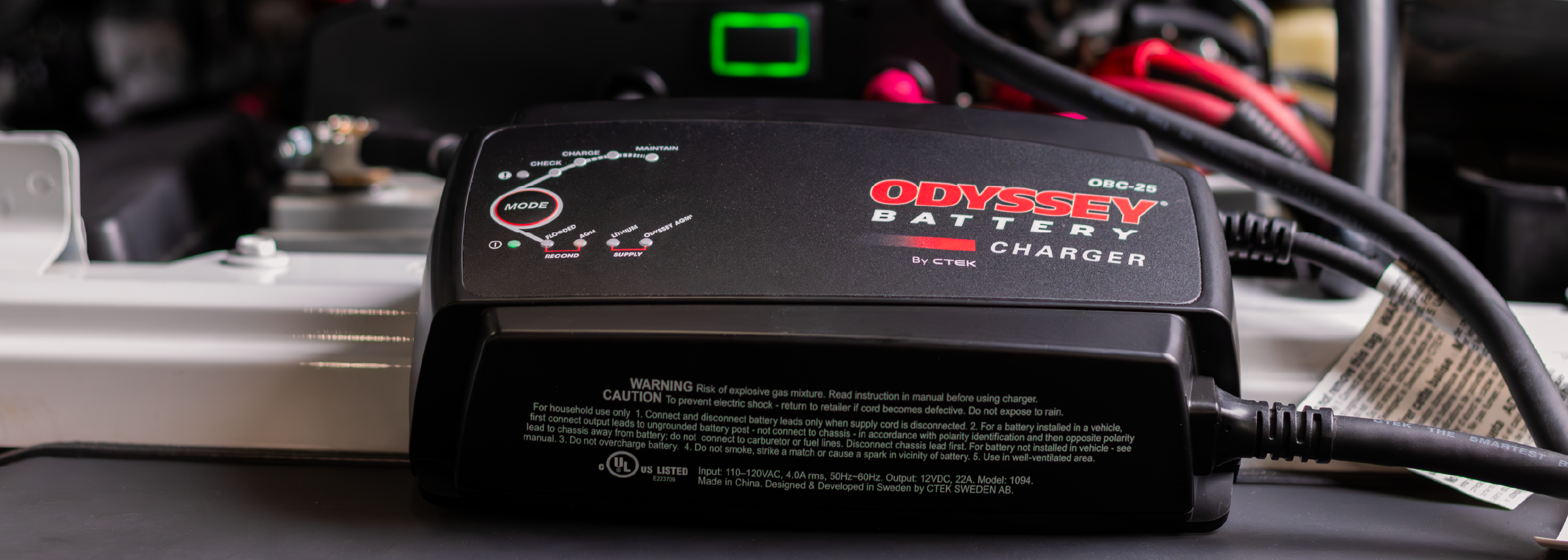 The ODYSSEY battery 25 Amp charger is designed for the automotive professional in mind. The charger combines power and advanced technology, and offers flexibility to charge 12-volt Absorbed Glass Mat (AGM), flooded lead acid batteries and 12-volt lithium batteries (LiFePO4, Li-Fe, Li-iron, LFP). The ODYSSEY battery 25 Amp charger is ideal for professional battery charging in the workshop or in the repair shop.