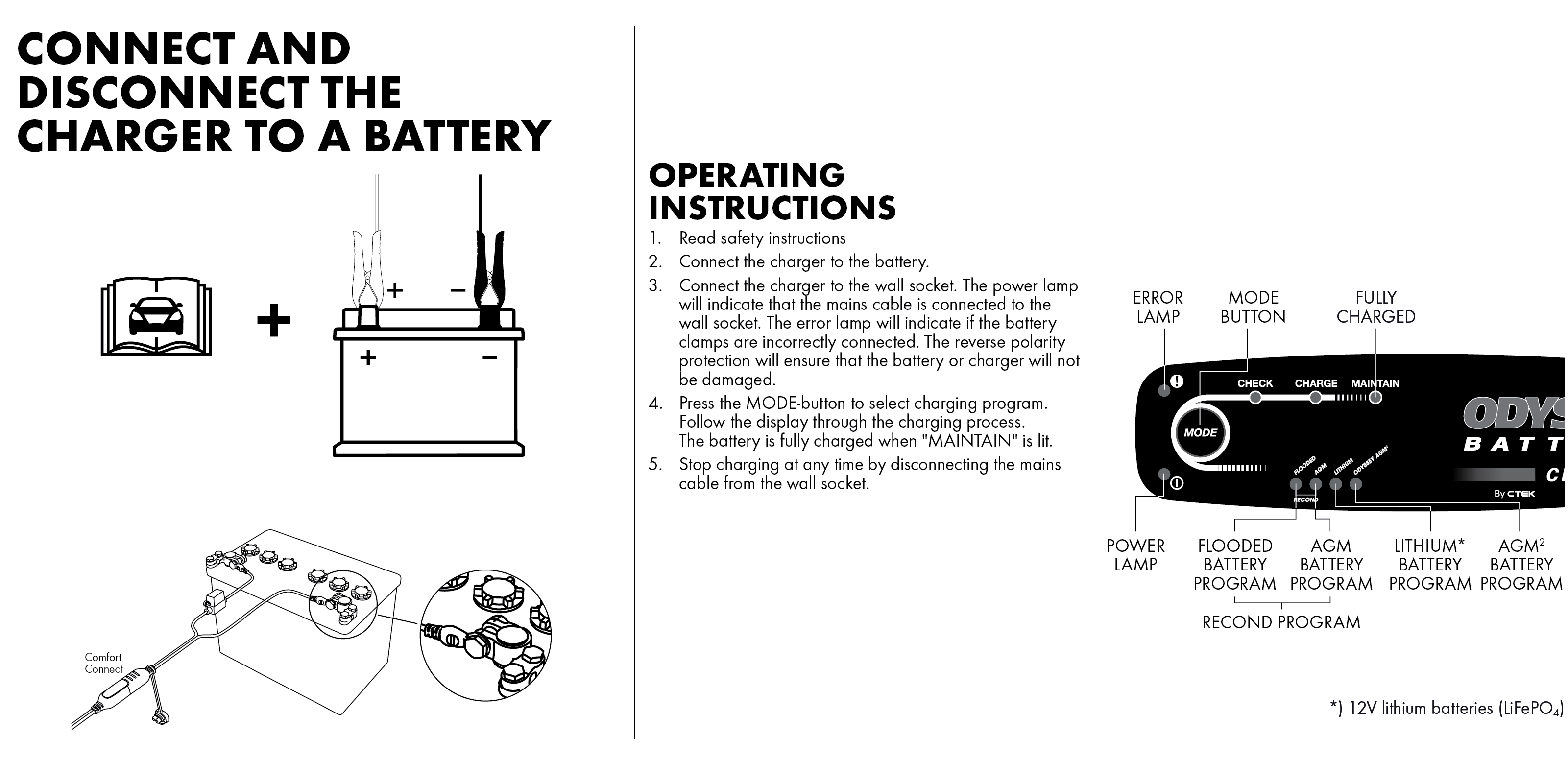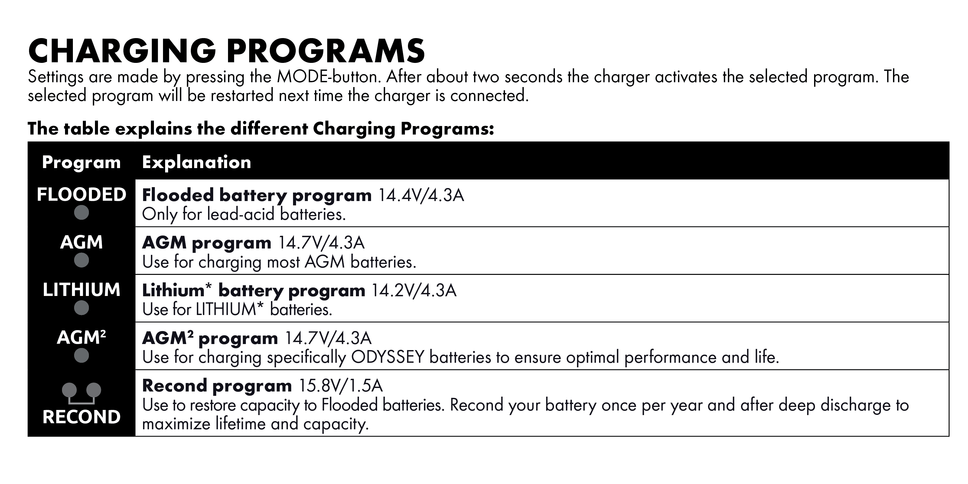 The ODYSSEY battery 5 Amp Charger is designed to efficiently charge ODYSSEY batteries and other quality brands of 12-volt Absorbed Glass Mat (AGM), flooded lead acid batteries and 12-volt lithium batteries (LiFePO4, Li-Fe, Li-iron, LFP). The 5 Amp charger is a good choice for charging smaller sized batteries, and is light and compact to easily transport.